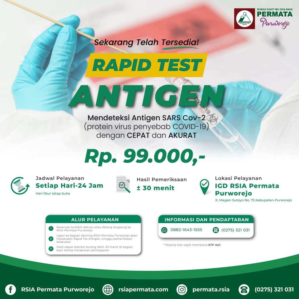 RSIA Permata Purworejo menyediakan Layanan Rapid Test Antigen, dengan jam pelayanan 24 jam setiap harinya, hasil test keluar dalam waktu kurang lebih 30 menit, tarif terjangkau Rp. 99.000.-